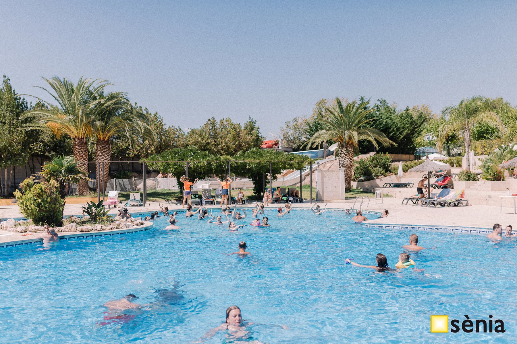 - Er is een zwembad met drie glijbanen